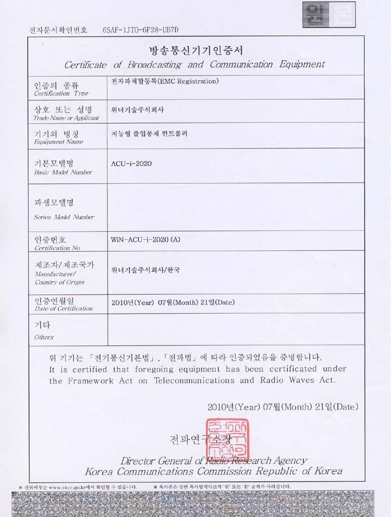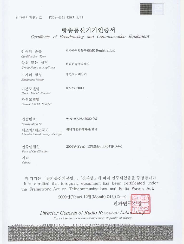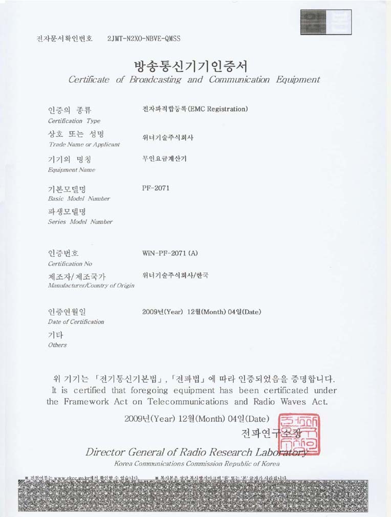무인요금계산기 KCC인증서