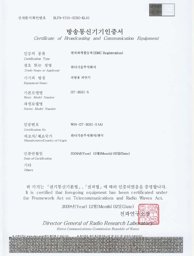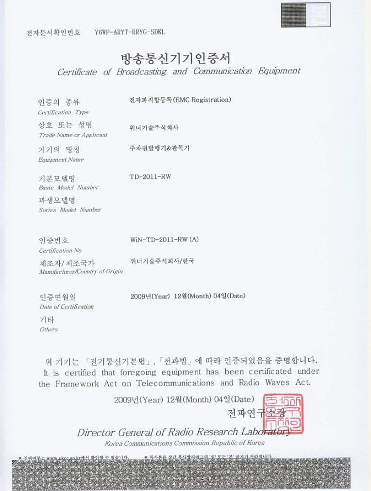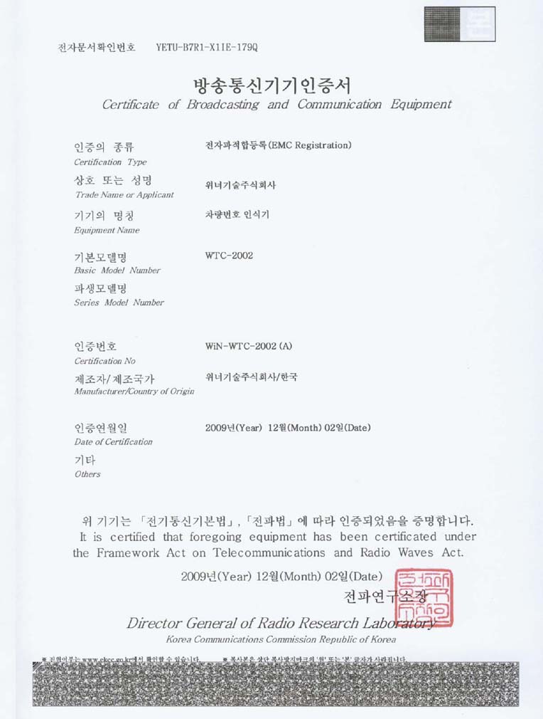 차량번호인식기 KCC인증서