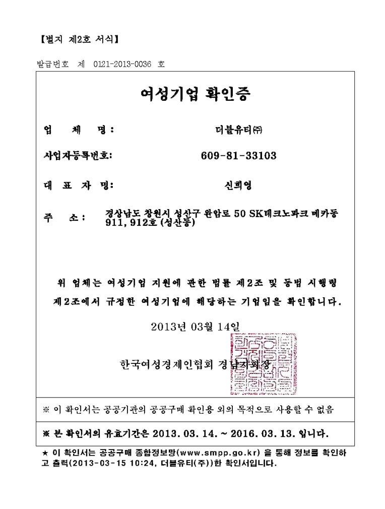 여성기업 확인증
