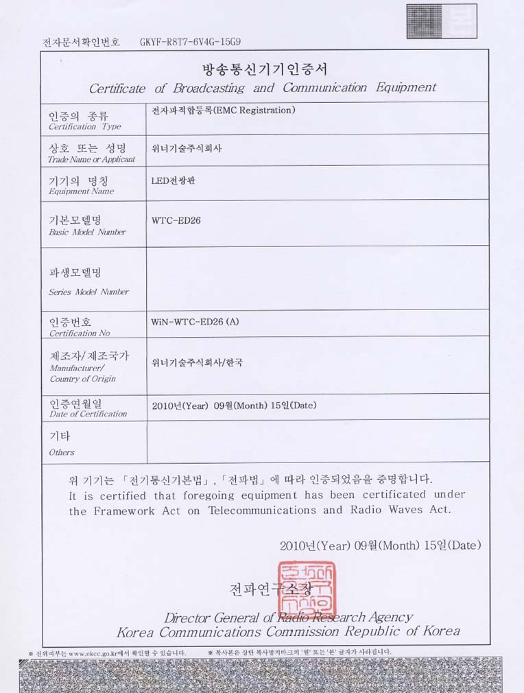 LED전광판 KCC인증서
