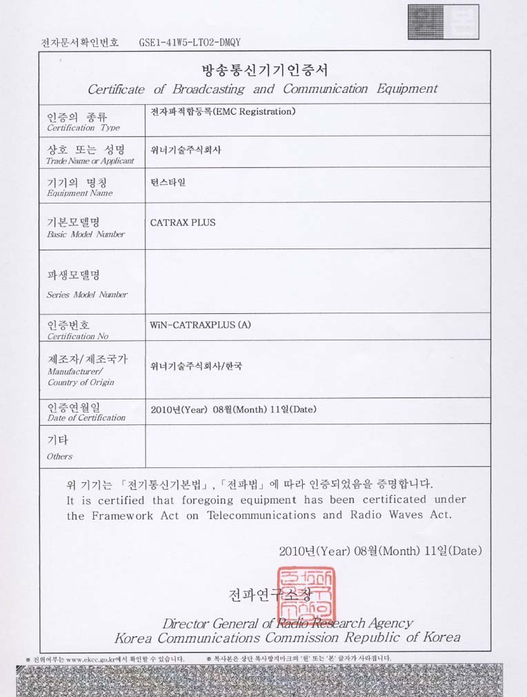 CATRAX PLUS 턴스타일 KCC인증서