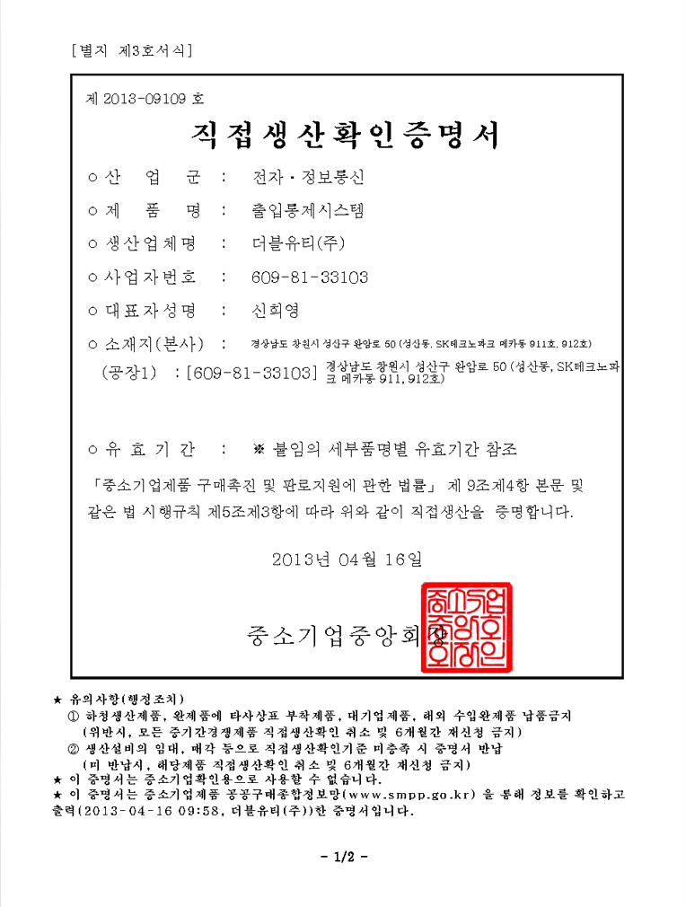 출입통제시스템 직접생산증명...