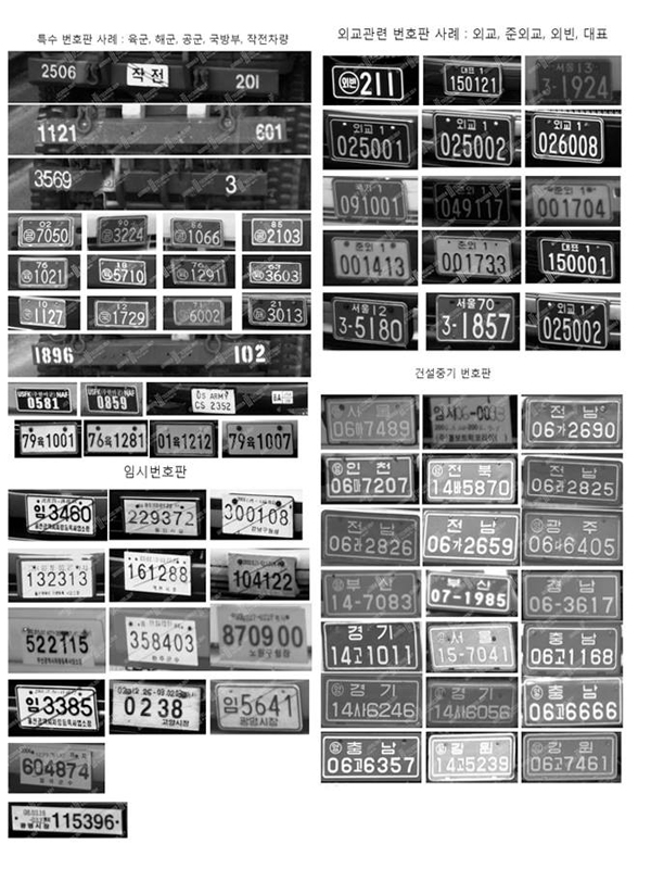 주차요금, 통행료면탈방지, 과속, 방범, 주정차위반, 세금미납 차량번호판영치 등의 용도로 사용되는 차량번호 인식기에 포착된 다양한 종류의 차량번호판 입니다.