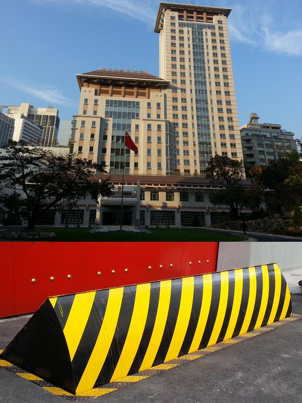 명동 인근에 새로 지은 중국대사관입니다. 주한 외국대사관 가운데 최대 규모(세계 두번째)로 지하 2층, 지상 24층입니다. 명동 2가 노란자위 땅에 위치한 중국대사관은 날로 커지는 중국의 힘을 확인할 수 있을 것입니다. 더블유티(주)는 최근 중국대사관 정문 테러방지시설을 납입하였습니다. 감사합니다.