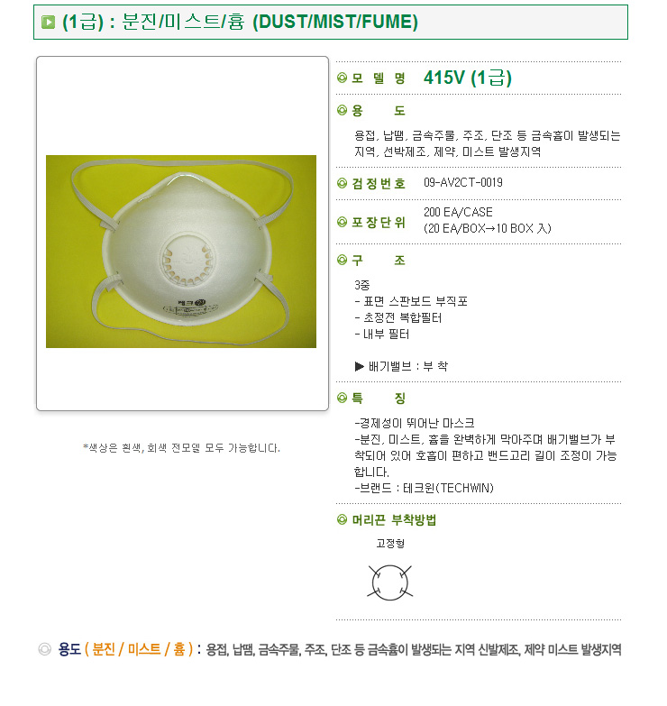 [산업안전] 크린탑 415VWS, 1급방진마스크 - 에버그린 밸브부착형마스크, 용접/납땜/금속주물/주조/단조 등 금속흄이 발생되는 지역, 선박제조/제약/미스트 발생지역, 안면부여과식방진마스크(Disposable Respirator Mask)